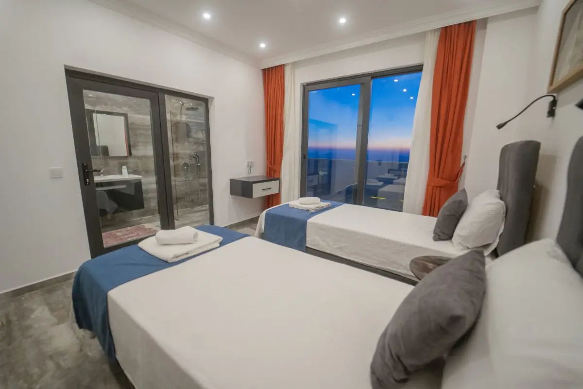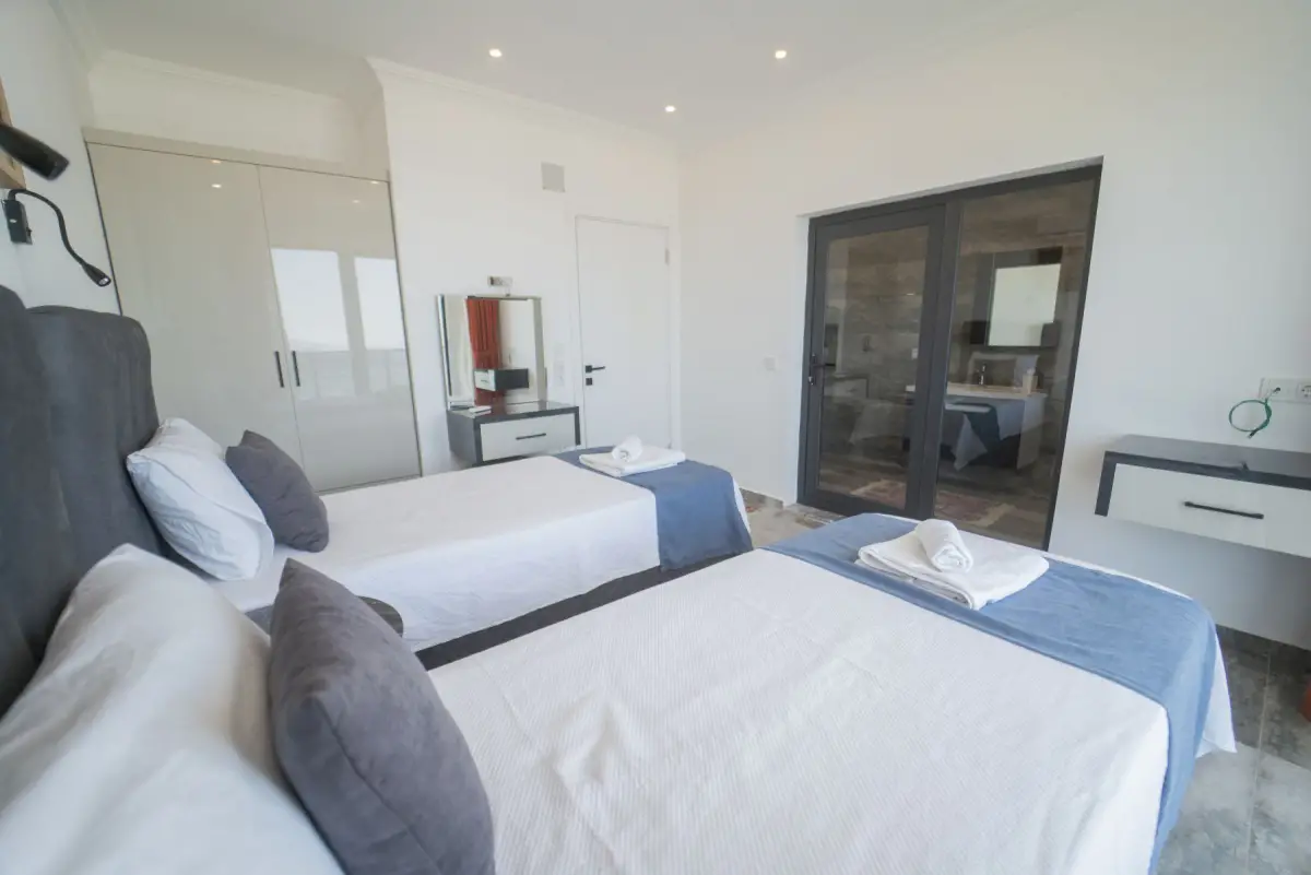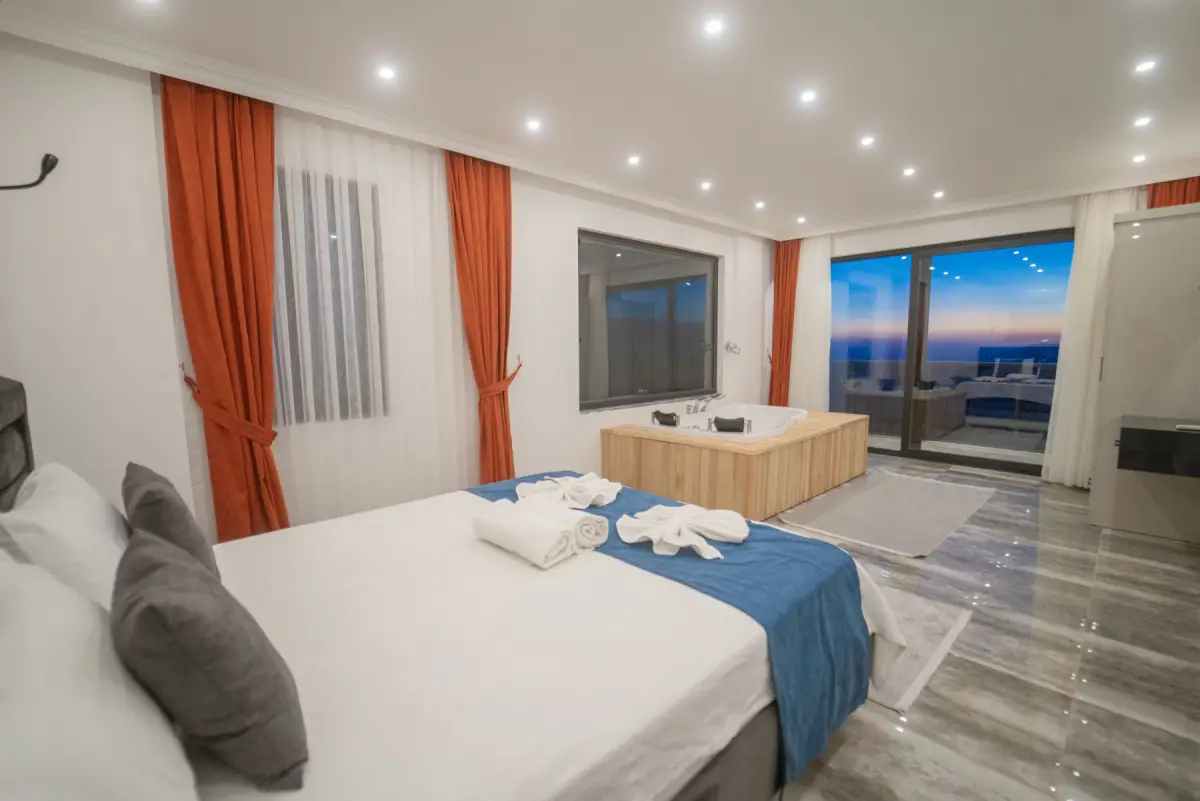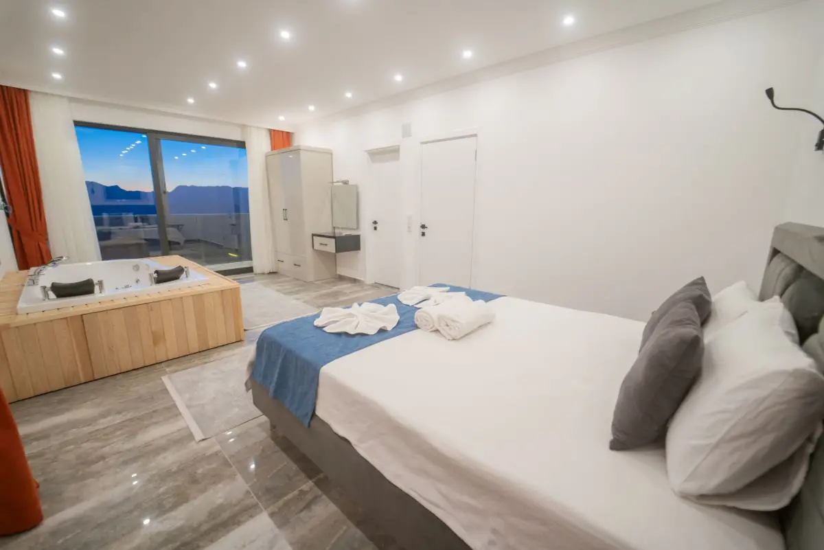 Villamız, muhteşem manzarası ile dikkat çeken lüks bir tatil seçeneğidir. 2 suit yatak odasıyla 4 kişiye kadar konaklama imkanı sunar. Ebeveyn yatak odasında çift kişilik yatak ve jakuzi bulunmaktadır; diğer yatak odasında ise 2 adet tek kişilik yatak mevcuttur. Her iki yatak odasında da özel banyo tuvalet ve klima bulunmaktadır.