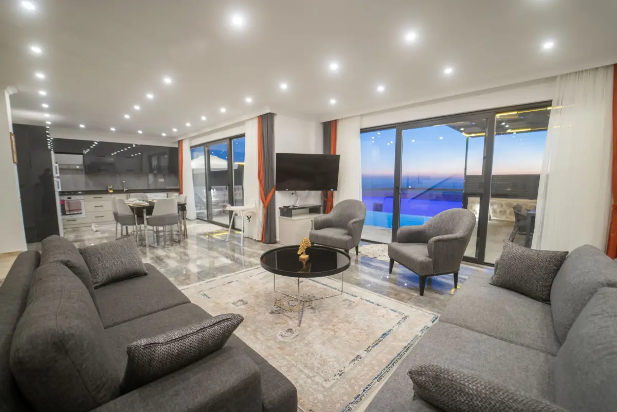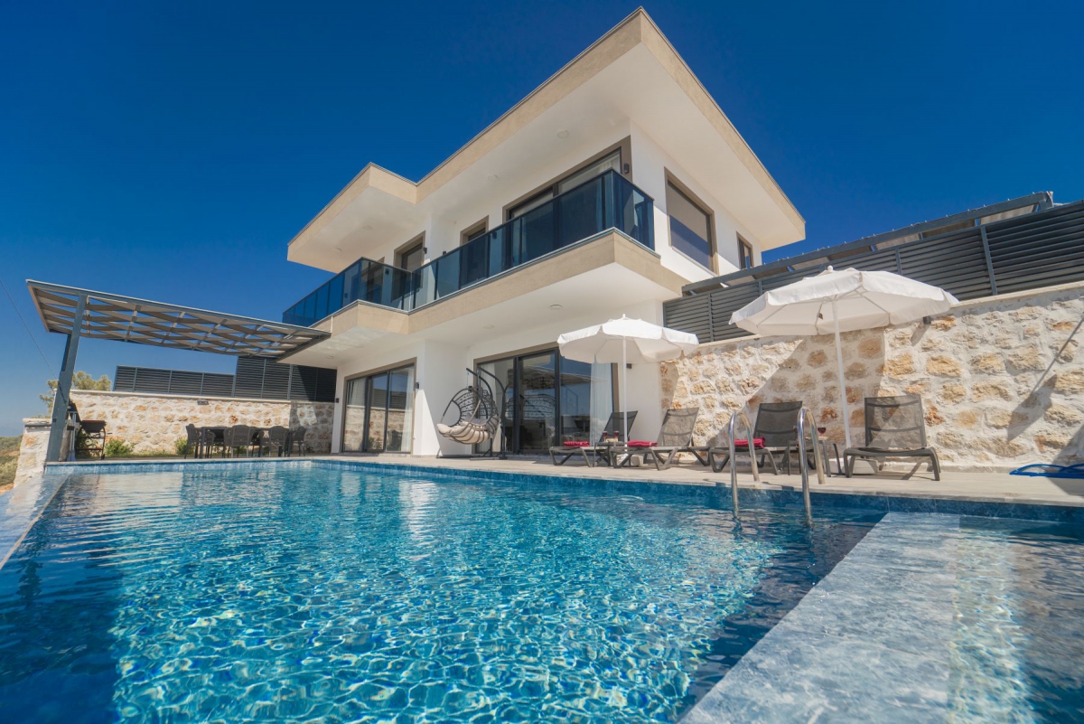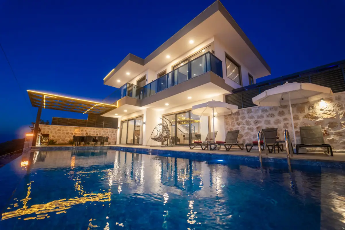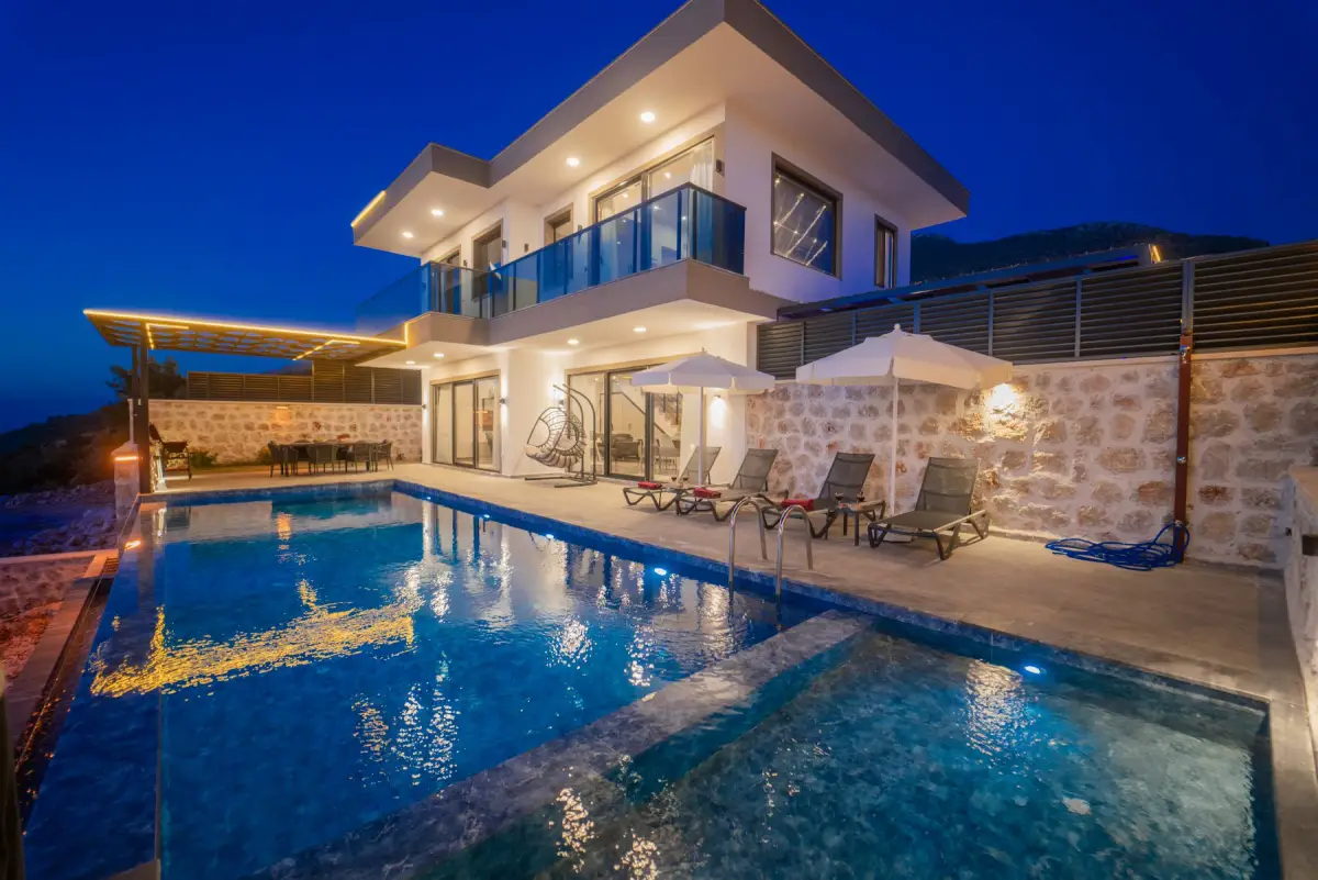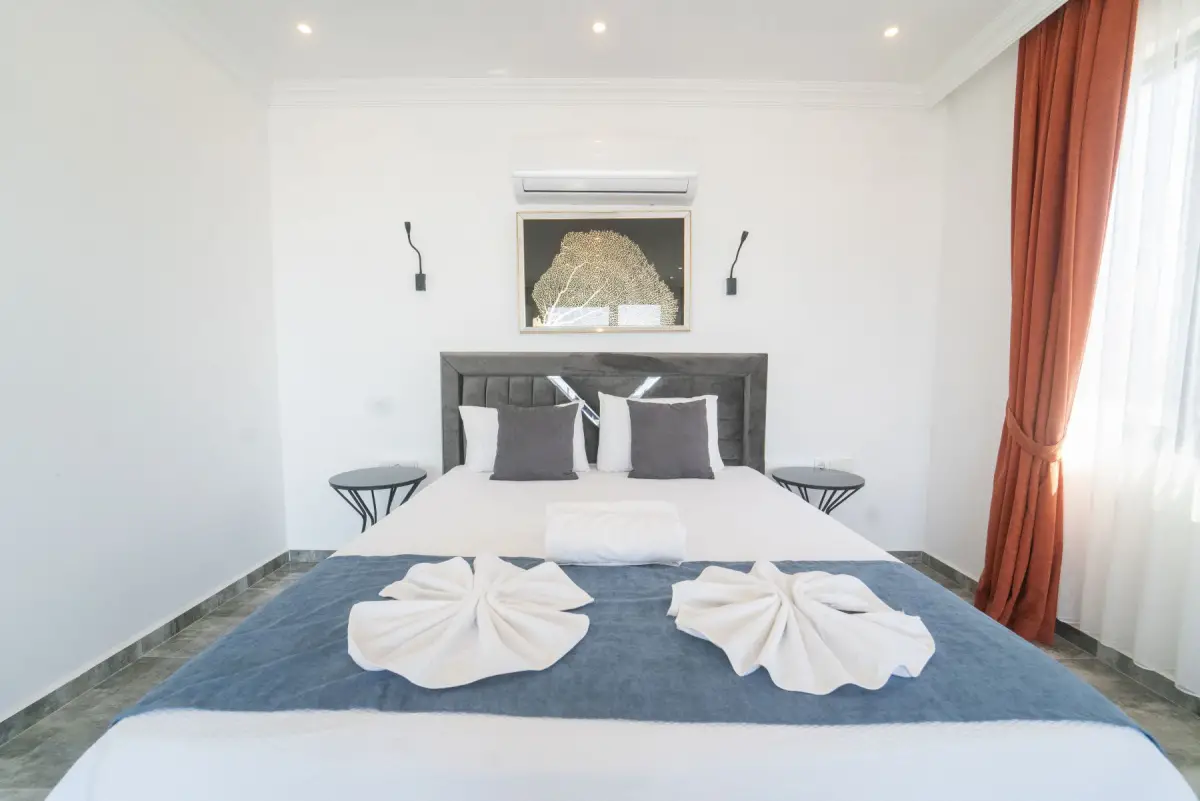 Villamız, muhteşem manzarası ile dikkat çeken lüks bir tatil seçeneğidir. 2 suit yatak odasıyla 4 kişiye kadar konaklama imkanı sunar. Ebeveyn yatak odasında çift kişilik yatak ve jakuzi bulunmaktadır; diğer yatak odasında ise 2 adet tek kişilik yatak mevcuttur. Her iki yatak odasında da özel banyo tuvalet ve klima bulunmaktadır.