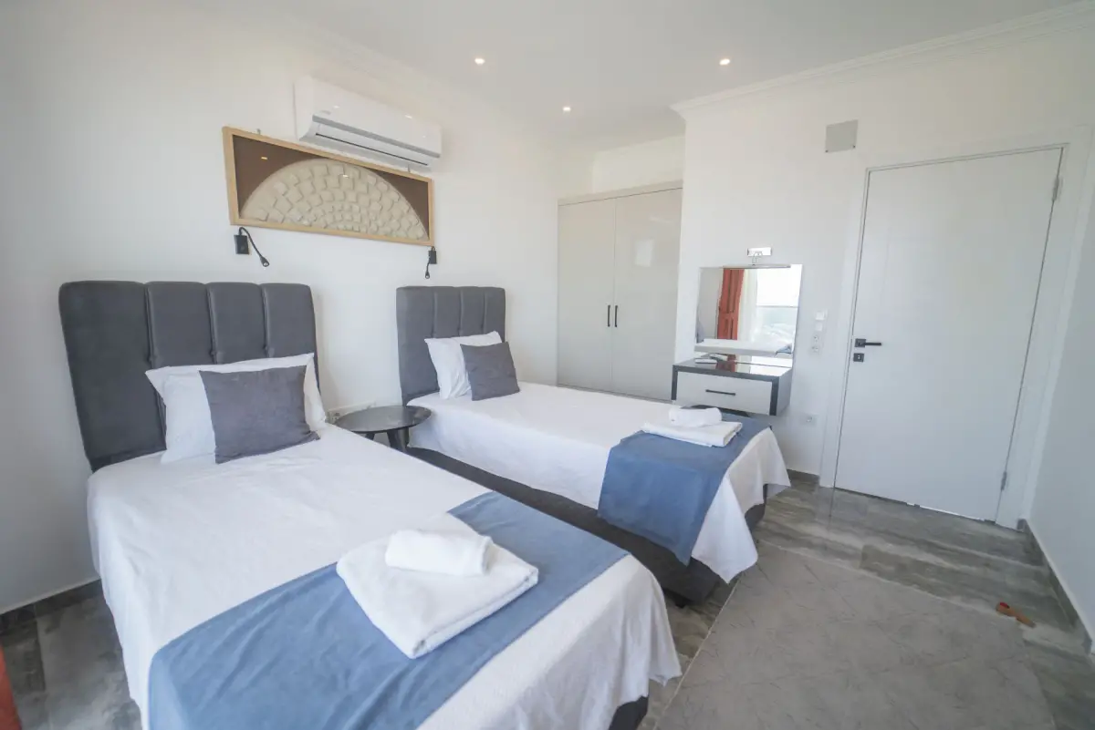 - Yatak Odası: 2 Tek Kişilik Yatak, Komodin, Banyo/WC, Klima, Elbise Dolabı