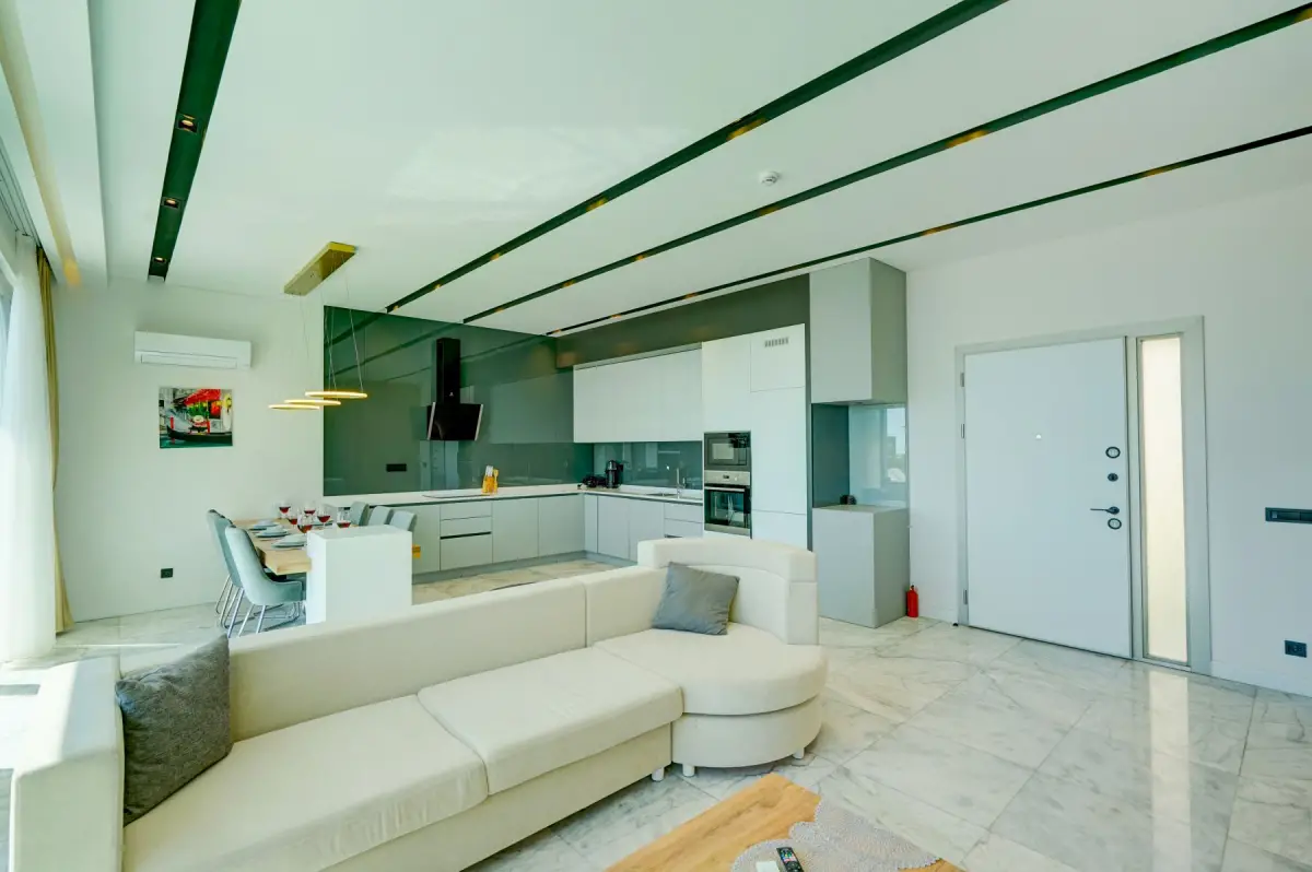 • Mutfak: Modern Amerikan mutfakta bulaşık makinesi, buzdolabı, ankastre fırın, mikrodalga fırın, ankastre 4’lü ocak, elektrikli su ısıtıcı, tencere ve tava takımı, yemek takımı, kaşık-çatal takımı ve bardaklar.
