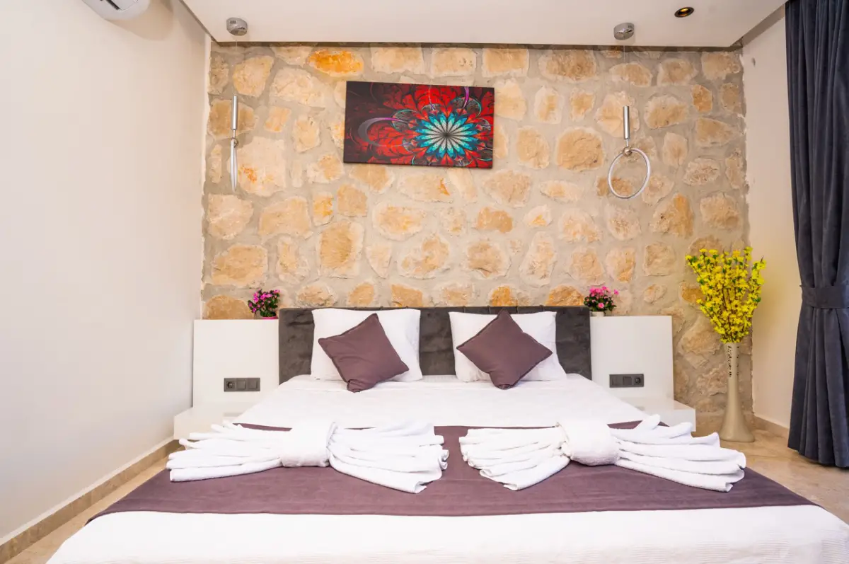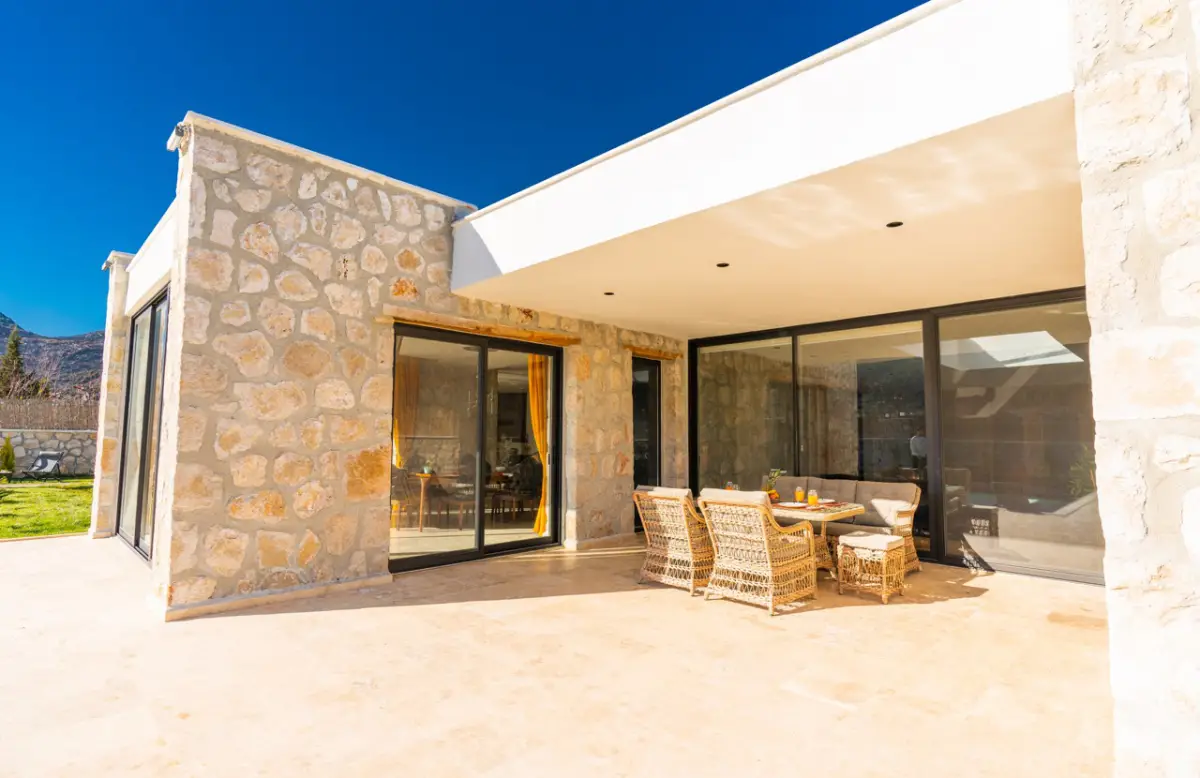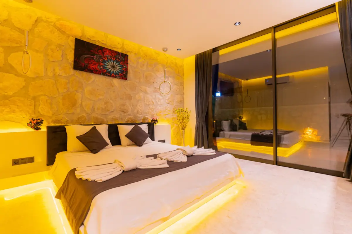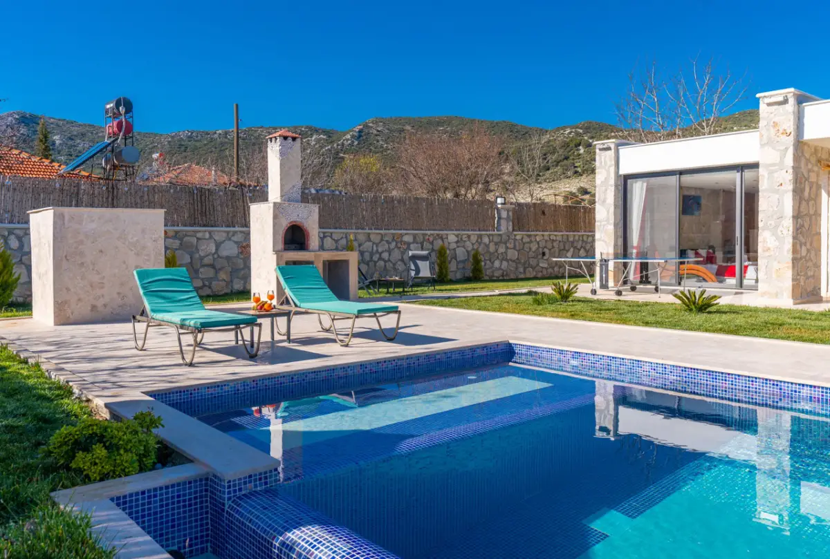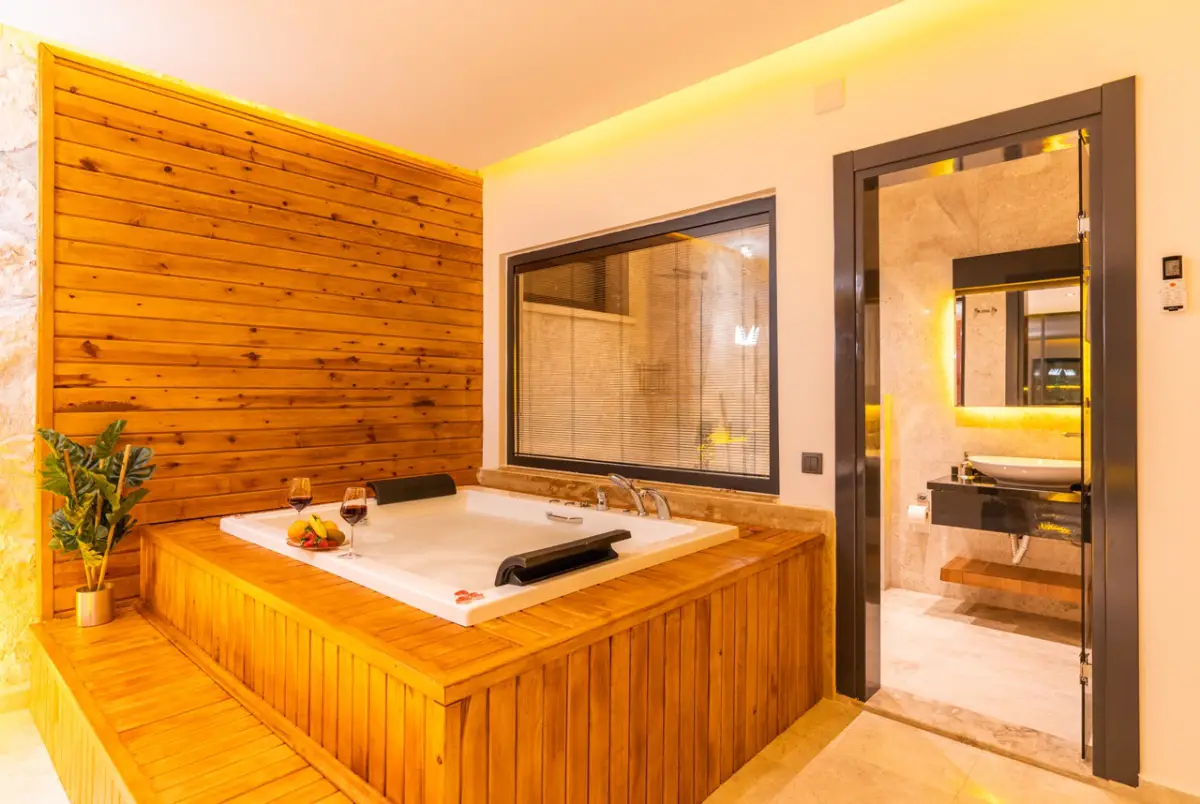 Korunakli Havuzlu, Jakuzili, Saunali, Kapali Havuz, Kalkan 3 yatak odali 7 kisilik kiralik villa