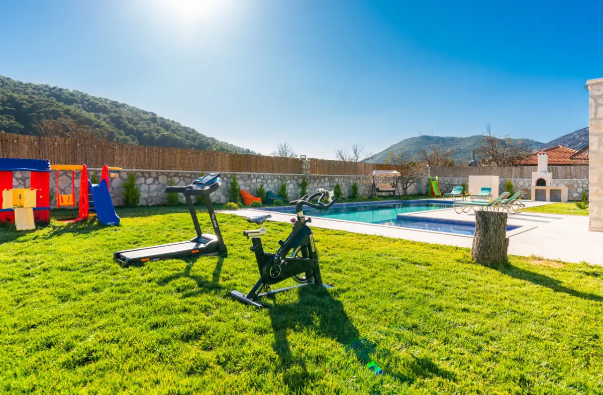 Havuz basinda sezlong, semsiye, mangal, oturma grubu, yemek masasi bulunmaktadir.